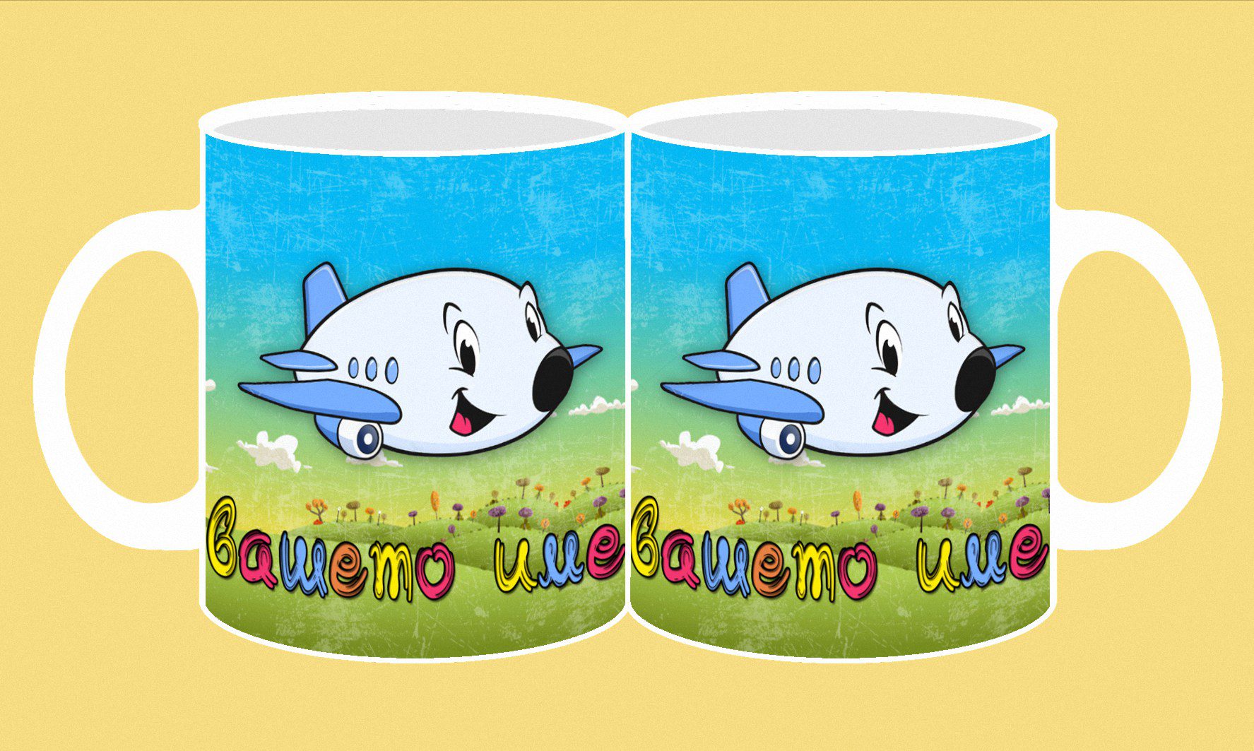 Фоточаша с конкретно детско име от двете страни на чашата с дизайн този от изображението пред вас.