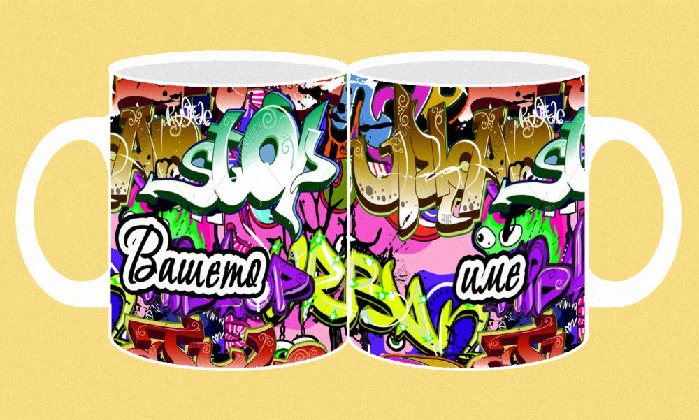 Фоточаша с конкретно име изписано с графити от двете страни на чашата с дизайн този от изображението пред вас