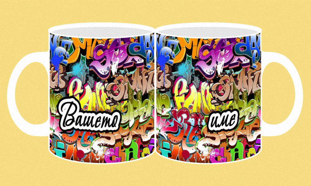 Фоточаша с конкретно име изписано с графити от двете страни на чашата с дизайн този от изображението пред вас