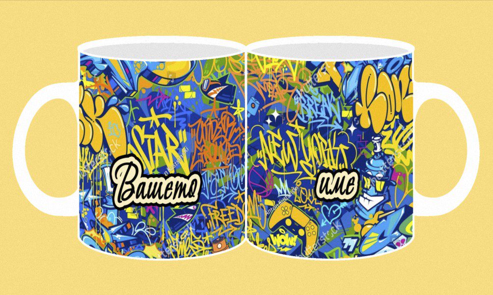 Фоточаша с конкретно име изписано с графити от двете страни на чашата с дизайн този от изображението пред вас