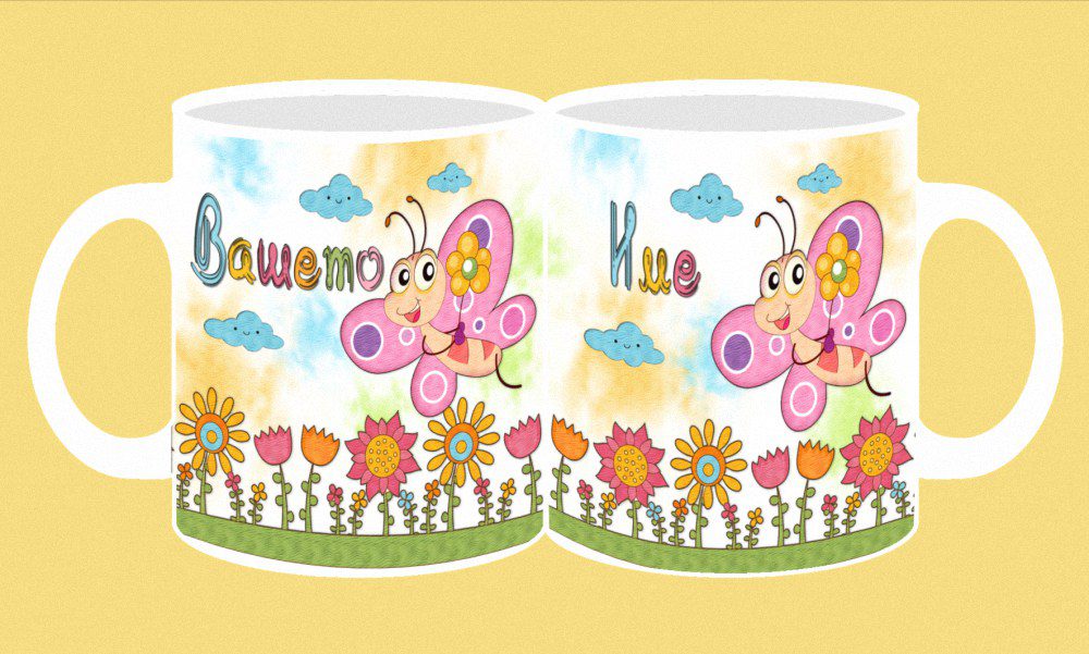 Фоточаша с конкретно детско име от двете страни на чашата с дизайн този от изображението пред вас.