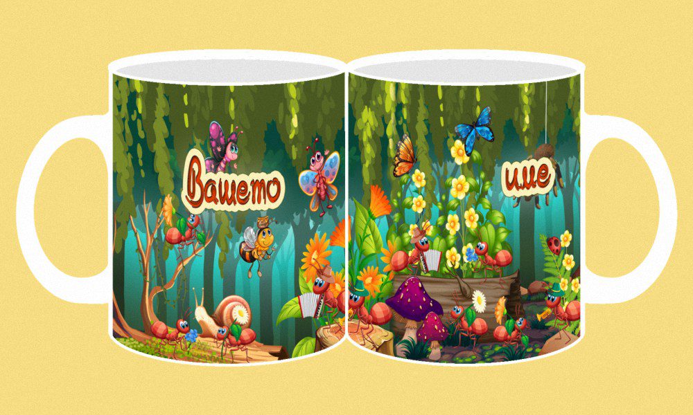 Фоточаша с конкретно детско име от двете страни на чашата с дизайн този от изображението пред вас.