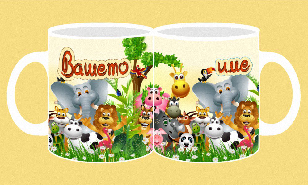 Фоточаша с конкретно детско име от двете страни на чашата с дизайн този от изображението пред вас.